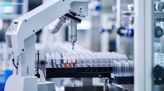 A robotic arm in a laboratory setting accurately dispenses a blue liquid into test tubes for analysis.