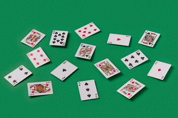 Scattered playing cards on green table