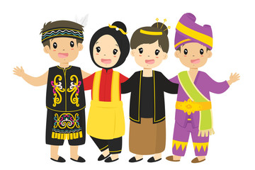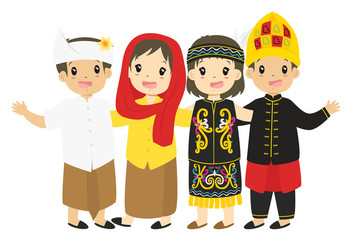 indonesian boys and girls wearing traditional dress embracing each other, cartoon vector