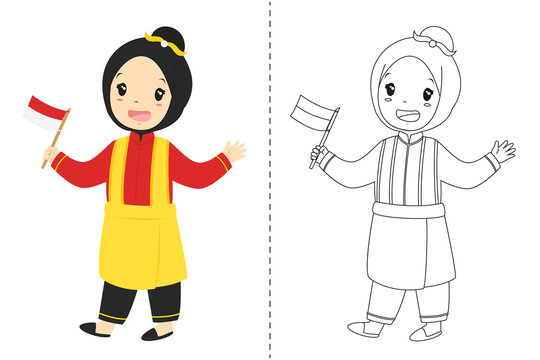 Children wearing Indonesian traditional dress, black and white outline cartoon vector for coloring page.