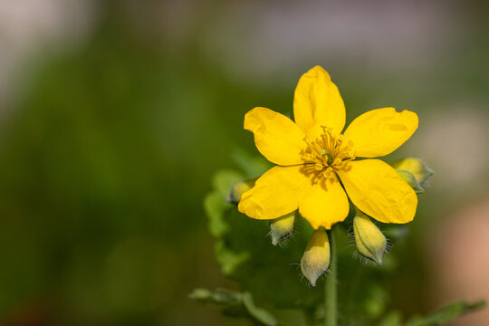 Close-up of yellow flower Chelidonium majus — greater celandine on soft, green natural background