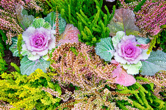 Decorative cabbage plant in bloom captured close-up with a colorful natural background