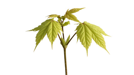 A young maple sapling with fresh, light green leaves and new buds emerging from a central stem, against a plain transparent background. background removed