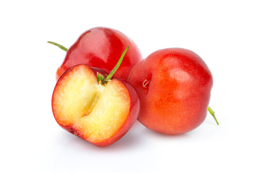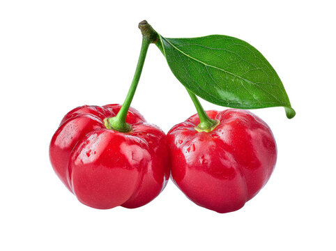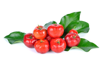 Fresh tropical acerola cherries with green leaves isolated on white background, vibrant red fruit