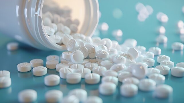 Round white pills scattered, offering relief and healing for your healthcare designs, conveying wellness and pharmaceutical solutions, perfect for medical projects