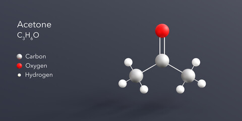 acetone molecule 3d rendering, flat molecular structure with chemical formula and atoms color coding