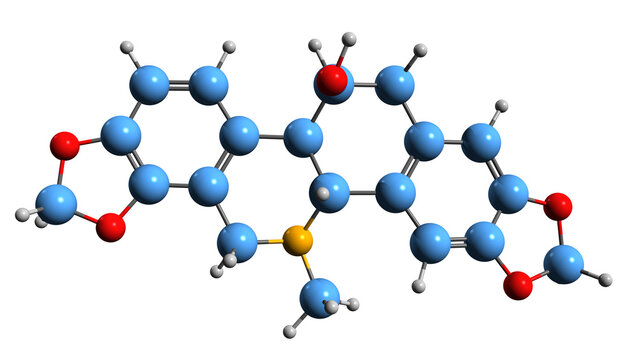 3D image of Chelidonine skeletal formula - molecular chemical structure of phytochemical isolated on white background
