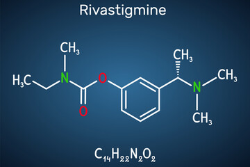 Rivastigmine molecule. It is acetylcholinesterase inhibitor, used for therapy of dementia, Alzheimer disease, Parkinson disease. Structural chemical formula on the dark blue background