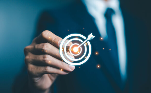 New Targeting with marketing business concept, Businessman hand holding red dart to the virtual target dartboard, Executive marketing, investment goal and target for business investment concept,