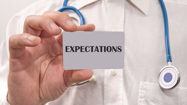 Word Expectations written on the card in the hand of a man in a white shirt