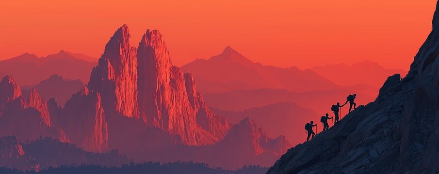 Mountain climbers support each other as they work together to reach their shared goal at the summit
