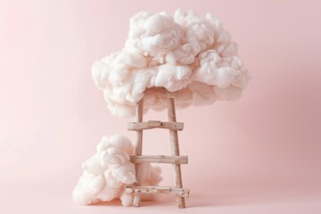 Surreal scene of a ladder leading to a cloud over the ocean, symbolizing dreams and aspirations