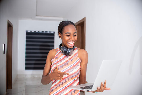 Cheerful young woman celebrating her achievement while reading good news on laptop