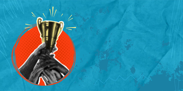 A modern halftone horizontal pop art collage. Cut-out hands hold a trophy symbolizing achievement, victory, and success. A trendy retro textured vector illustration for mixed media design on a blue ba