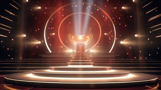 A shining trophy rests atop a blue staircase, embodying the essence of achievement against a crisp white backdrop.