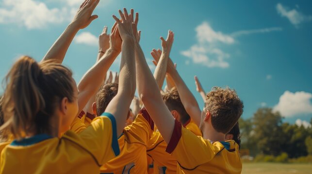 A cheerful female soccer team celebrates victory and carries on with teammates shouting with joy in the stadium.