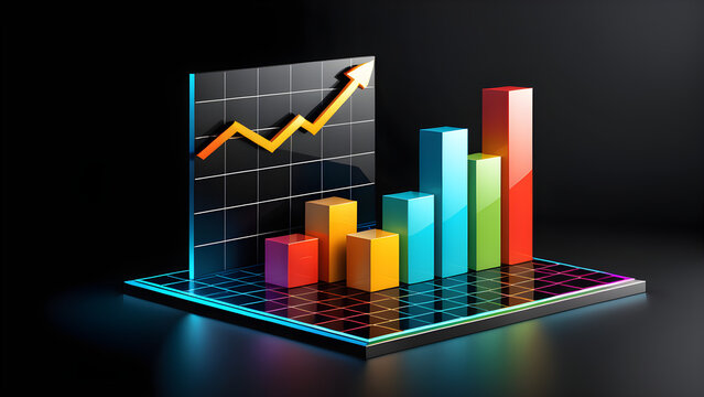 The business growth bar chart 3d is isolated on a black background.png. Abstract infographic 3d bar finance, minimal data analysis icon. soaring finances. success financial. With black copy space