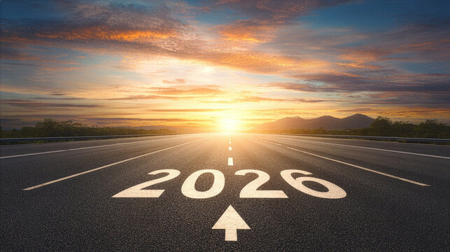 Road to 2026 with an empty road with written 2026 and arrow pointing towards the horizon to represent the future and positivity and success of the new year 2026