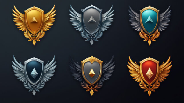 Gold game badge rank medal ui icon vector set. Isolated level trophy cartoon insignia military achievement award. Hexagon label with wings button design for 1st winner prize interface collection.
