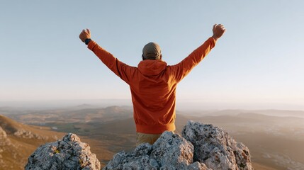 Successful woman joy when reaches to her objective. Woman jump on top of the mountain with arms open to a welcoming new day with sunrise, Generative AI