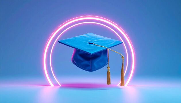 Blue graduation cap with gold tassel floating in neon arc, symbolizing achievement and modern celebration.