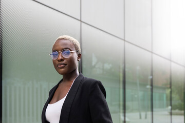 Confident businesswoman standing by modern office building