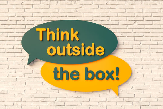 Think outside the box. artoon speech bubble in yellow and dark green, brick wall. Inspiration, motto, thinking, intelligence, variation, complexion, abstract, individuality. 3D illustration
