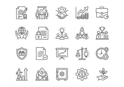 Business and finance line icon set. Vector symbols for partnership, collaboration, success, money, and contract. Clean outline style.