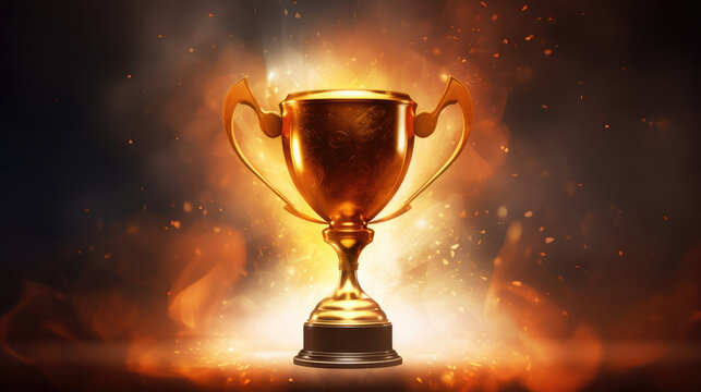 Vintage gold trophy with blue ribbon on a dark teal background, highlighting the trophy as the central subject, emphasizing the victory and achievement theme