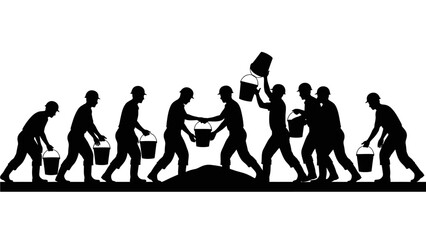 Collaboration and teamwork illustrated through a chain of people passing buckets over a mound