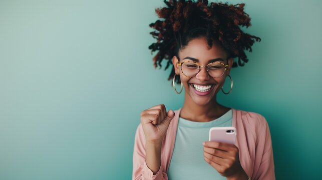 African American woman smiling at phone screen, celebrating with raised fist while holding phone, concept of winning, solid green background.
