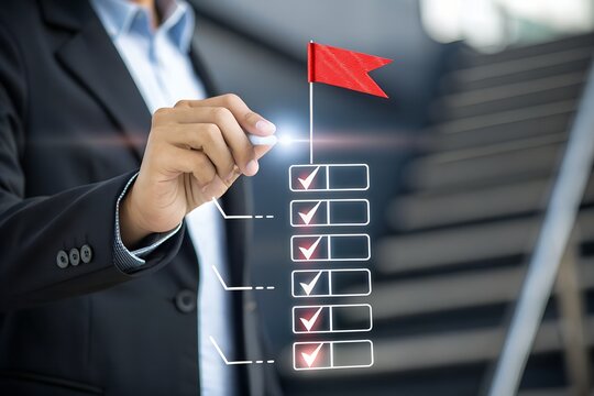 Business success and goal achievement steps. Businessman drawing checkmarks on virtual staircase steps toward achieving goals, ending with red flag as success marker. Planning, progress, goal setting,