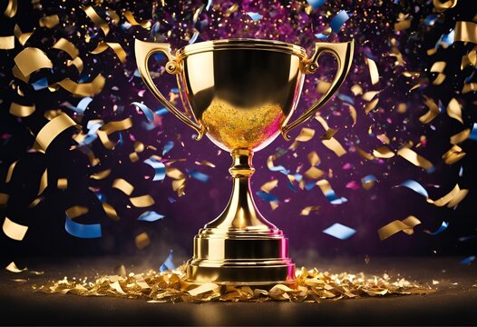 A gleaming gold trophy takes center stage amid colorful celebration confetti and sparkling glitter, symbolizing victory and success in competitive events and achievements