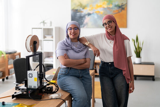Two women in hijabs pose confidently in a 3D printing lab, surrounded by equipment and tools. Their stance reflects confidence and pride in their work and achievements in technology.