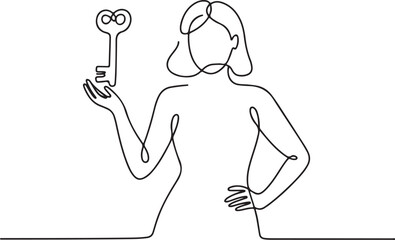 Empowered woman in continuous line art holds a key, representing unlocking opportunities, finding solutions, and achieving success