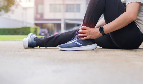 Woman experiencing pain in her ankle and leg due to ankle sprain or Achilles tendonitis. Medical and health concept.