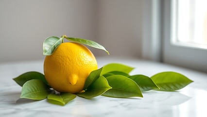 Fresh lemon with green leaves on marble, bathed in natural window light for a vibrant minimalist scene.