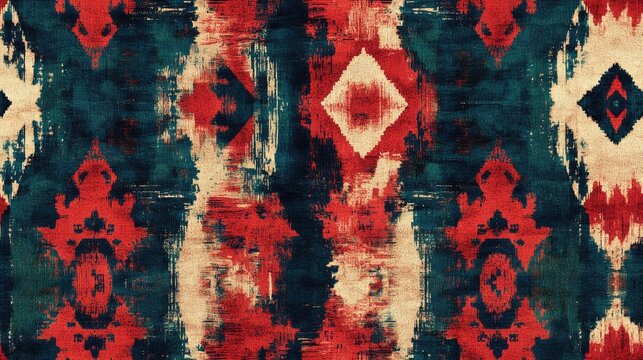 Ikat pattern featuring red and blue hues a seamless bohemian design with traditional folk motifs Organic texture resembling a woven carpet in acid hippie style Rustic tribal art showcasing vibrant