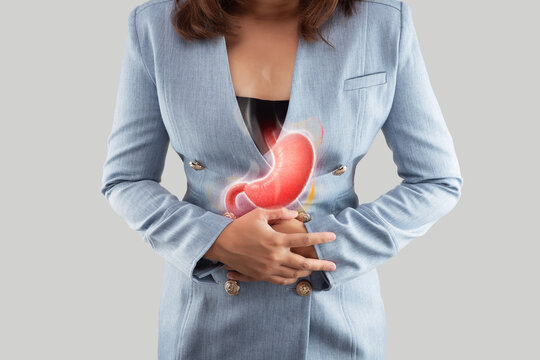 Woman suffers from acid reflux symptom in upper abdominal area.