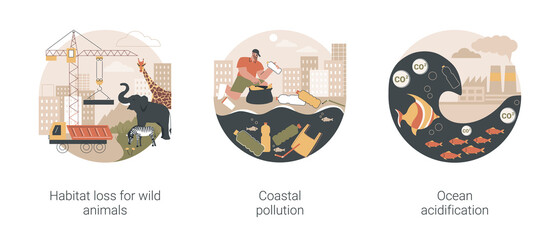 Environmental change abstract concept vector illustration set. Habitat loss for wild animals, coastal pollution, ocean acidification, wildlife loss, beach area clean up, toxic waste abstract metaphor.