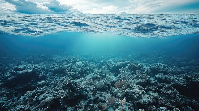 Dead coral reefs juxtaposed with vibrant, healthy reefs, showcasing the devastating impact of ocean acidification and coral bleaching.