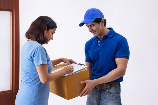 Smart Indian woman signing a home delivery receipt of a package at the time of delivery