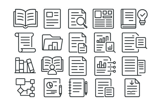 Solid Line Knowledge Icons. Knowledge sources linear icon set: library shelf, digital archive, lecture podium, research folder, document page, study lamp, globe, citation tag