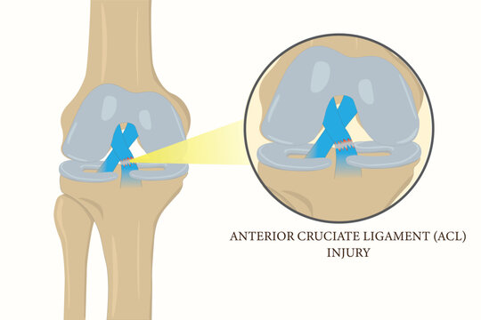 Medical illustration of anterior cruciate ligament (ACL) tear showing knee joint injury detail. eps 10