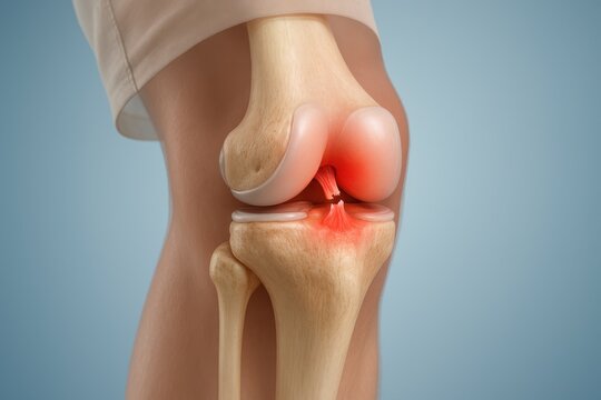 3D medical anatomical close-up view of knee showing ACL tear with two separated ligament ends and red halo around rupture, realistic visualization of anterior cruciate injury and joint instability
