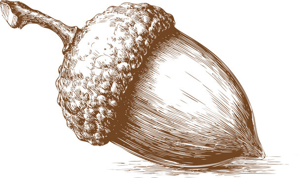 Detailed ink sketch of an acorn with textured cap and shading. Vector illustration