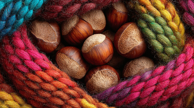 A cluster of chestnuts nestled within a cozy, vibrantly colored knitted blanket, a perfect representation of autumn and warmth