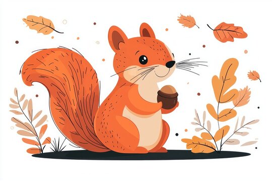 cheerful squirrel holds acorn while sitting on branch. Surrounded warm autumn colors it embodies charm of woodland environment during fall.