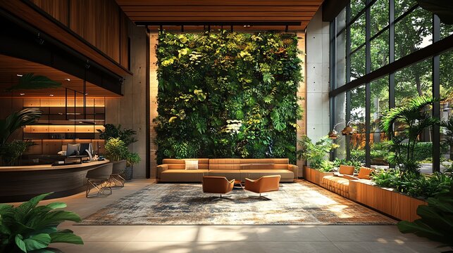 Ecoconscious office design with a vertical green wall, abundant plants, and natural elements, fostering a productive, healthy, and wellnessfocused workspace