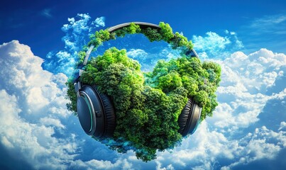 Headphones with green foliage against a blue sky and cloudscape background